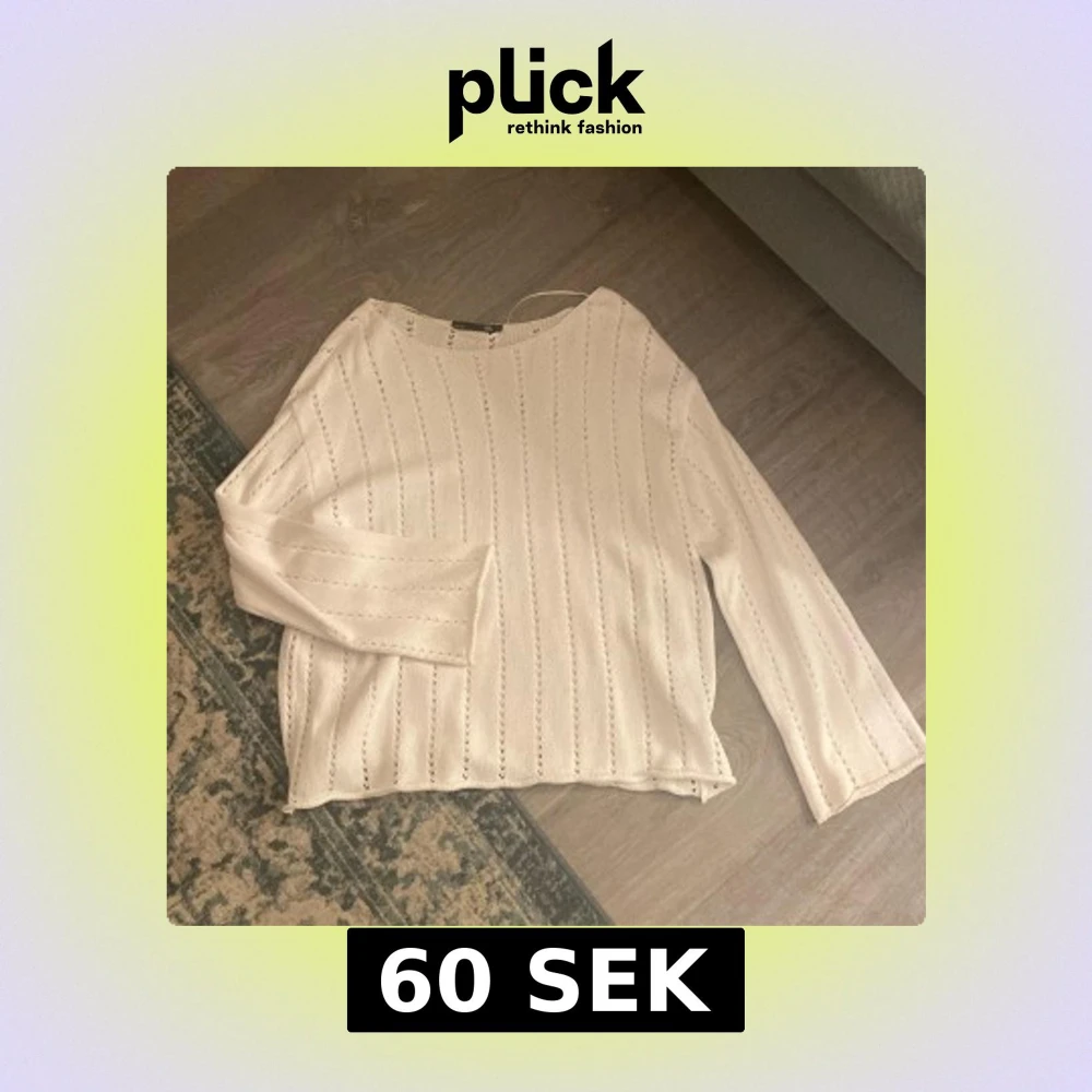 Säljer en stilren vit tröja med lång ärm och ett subtilt randigt mönster. Tröjan har en oversize passform och är tillverkad i ett lätt material.