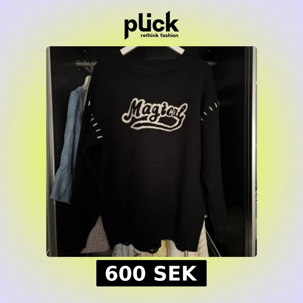 Svart stickad tröja från MacyMccoy med vit broderad text 'Magical' på bröstet. Tröjan har långa ärmar, ribbade muddar och slitna detaljer vid fållen och ärmsluten samt vita stygn längs axlarna.