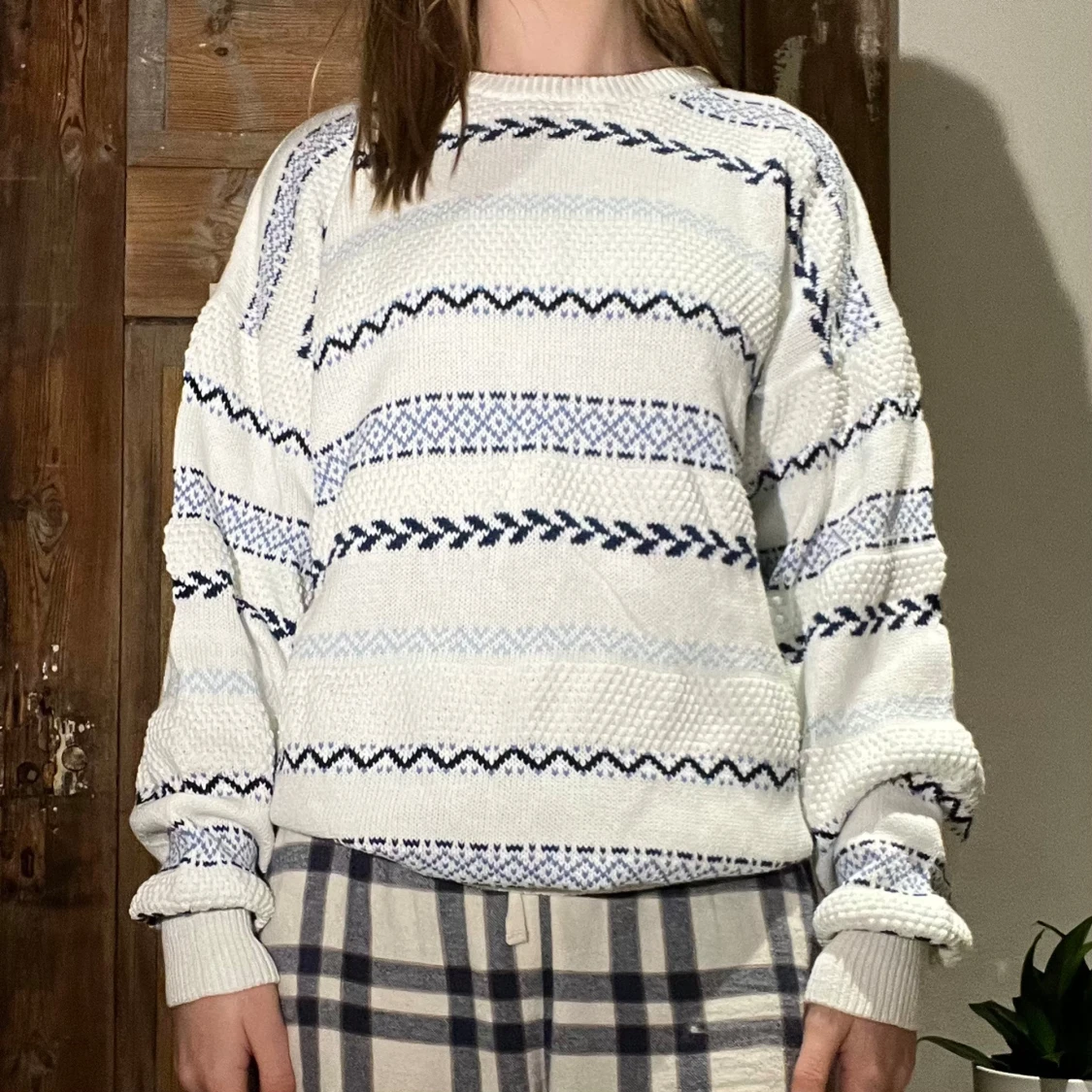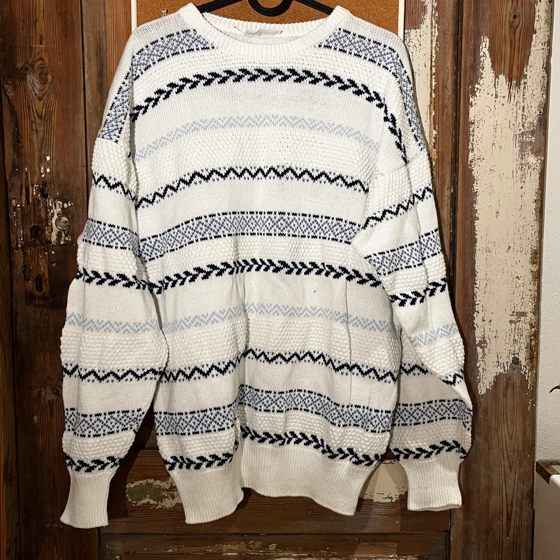 Säljer en mysig vit stickad tröja med blå mönster. Säljer då den är lite för stor för mig och inte kommer till användning Den är både stilren och bekväm, inga defekter. Skriv för fler bilder 💕