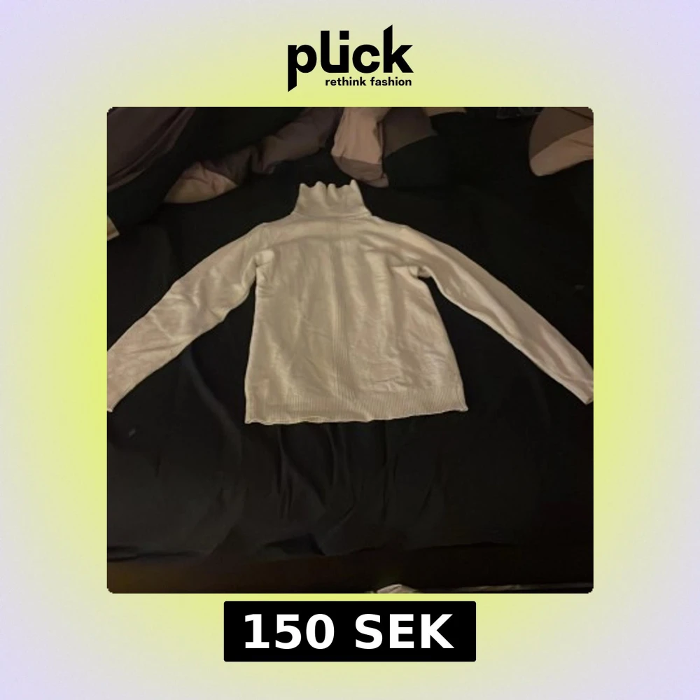 Säljer en vit polotröja med lång ärm och hög krage. Tröjan har en snygg ribbad detalj som går längs mitten både fram och bak, samt ribbade muddar vid nederkant och hals. Perfekt för dig som gillar stilrena och klassiska plagg.
