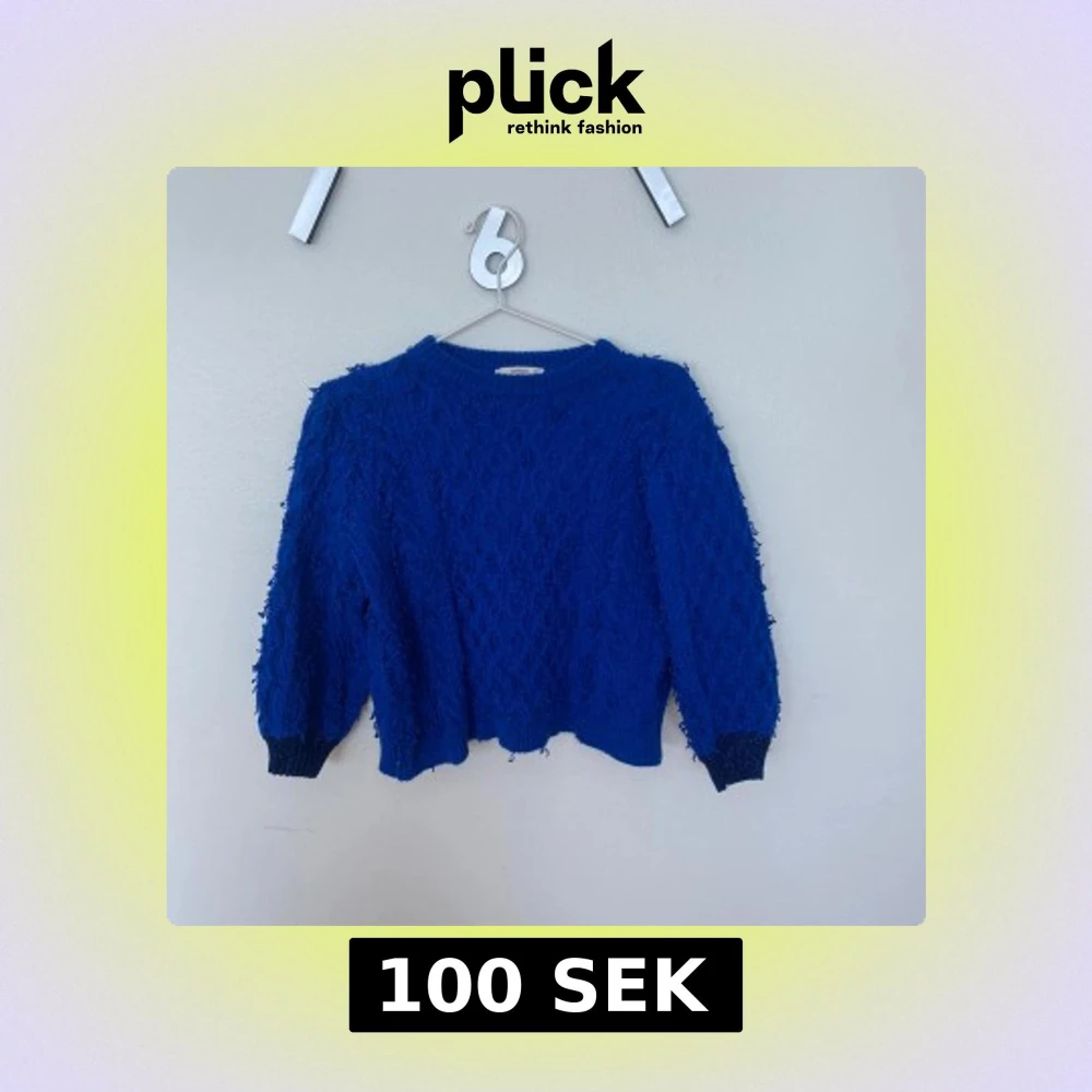 Blå stickad tröja från Mango med strukturmönster och glittriga muddar vid ärmsluten.