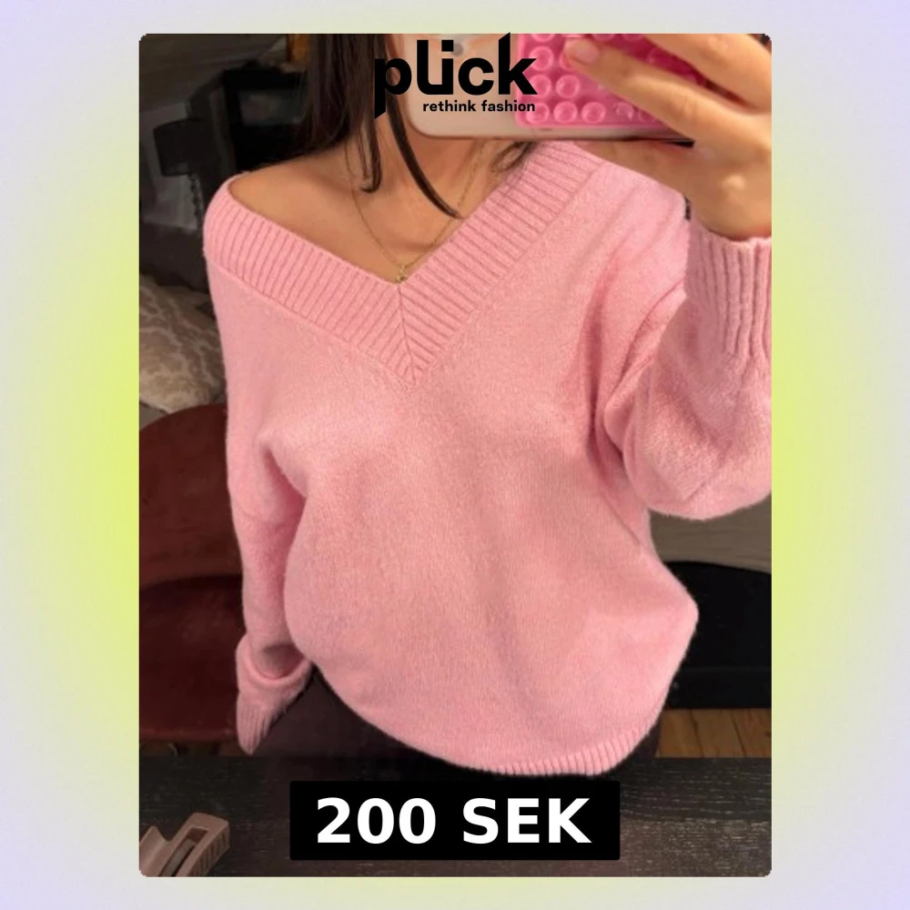 Superfin ljusrosa stickad tröja med bred v-ringning som går att bära offshoulder. Tröjan har långa ärmar och ribbade muddar vid hals, ärmslut och nederkant. Perfekt för dig som gillar en avslappnad men söt stil.