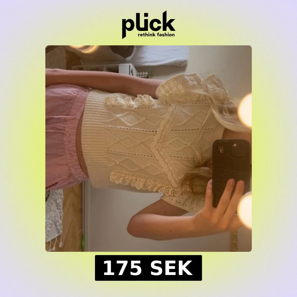 Supersöt stickad topp i ljusbeige från Mango. Ärmlös modell med bred ribbad midja, dekorativa spetsdetaljer och mönstrad stickning. Andvänd ca 2 gånger.