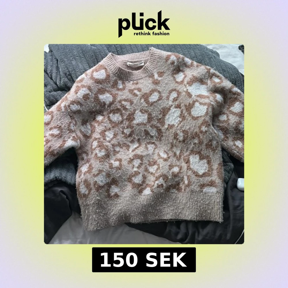 Säljer en mysig beige stickad tröja med leopardmönster. Tröjan har en rund hals och långa ärmar, perfekt för kyliga dagar. Den är både stilren och bekväm.