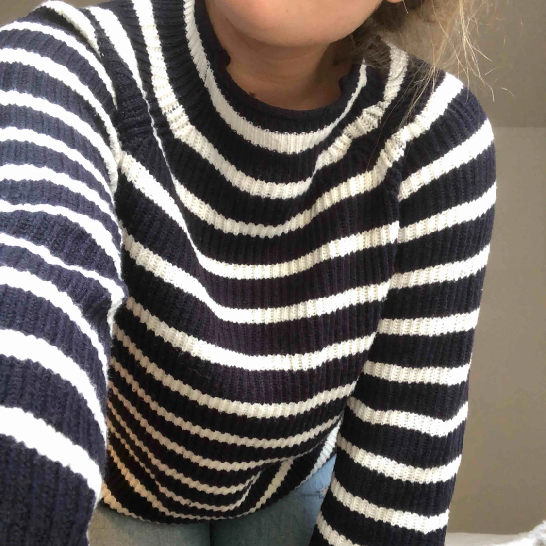 Marinblå randig tjocktröja köpt från mango. Använd fåtal gånger. Möter upp i Lund/Malmö annars står köparen för eventuell frakt