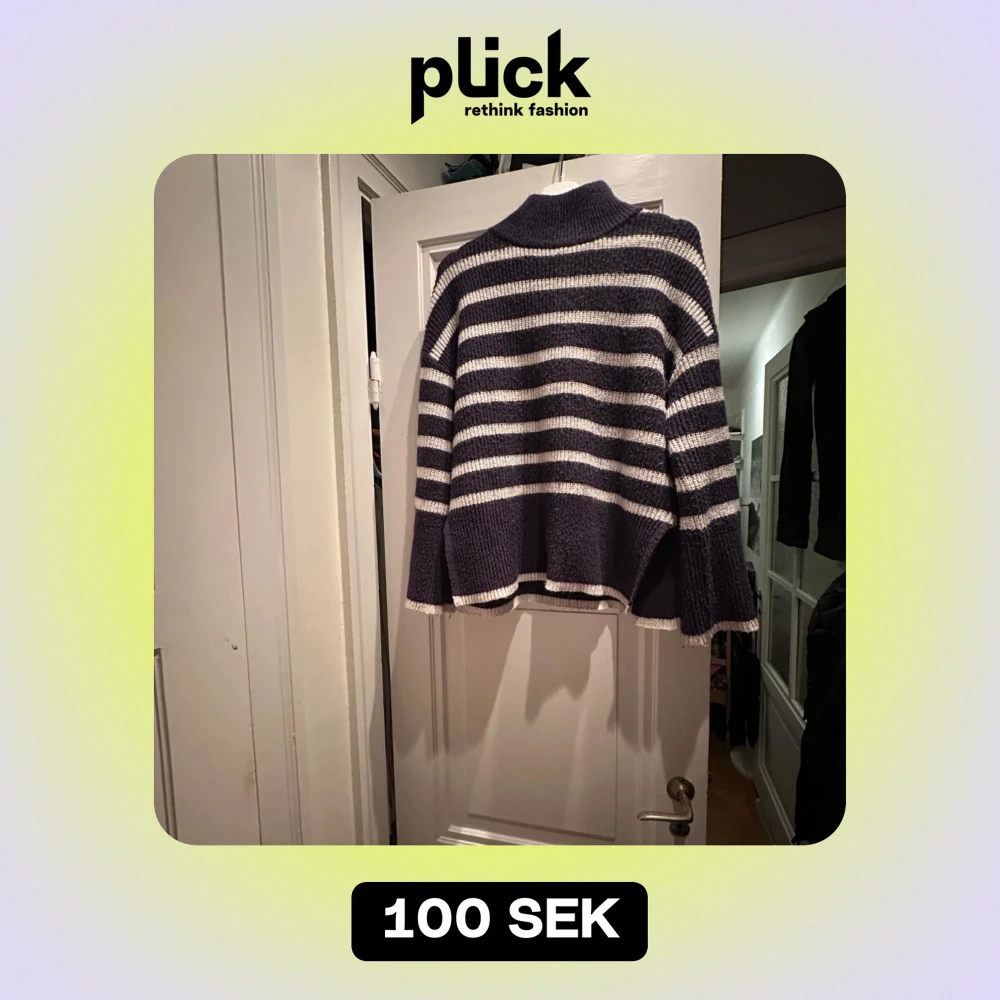 Mysig stickad tröja i marinblått och vitt med högre krage. Perfekt för kyliga dagar.