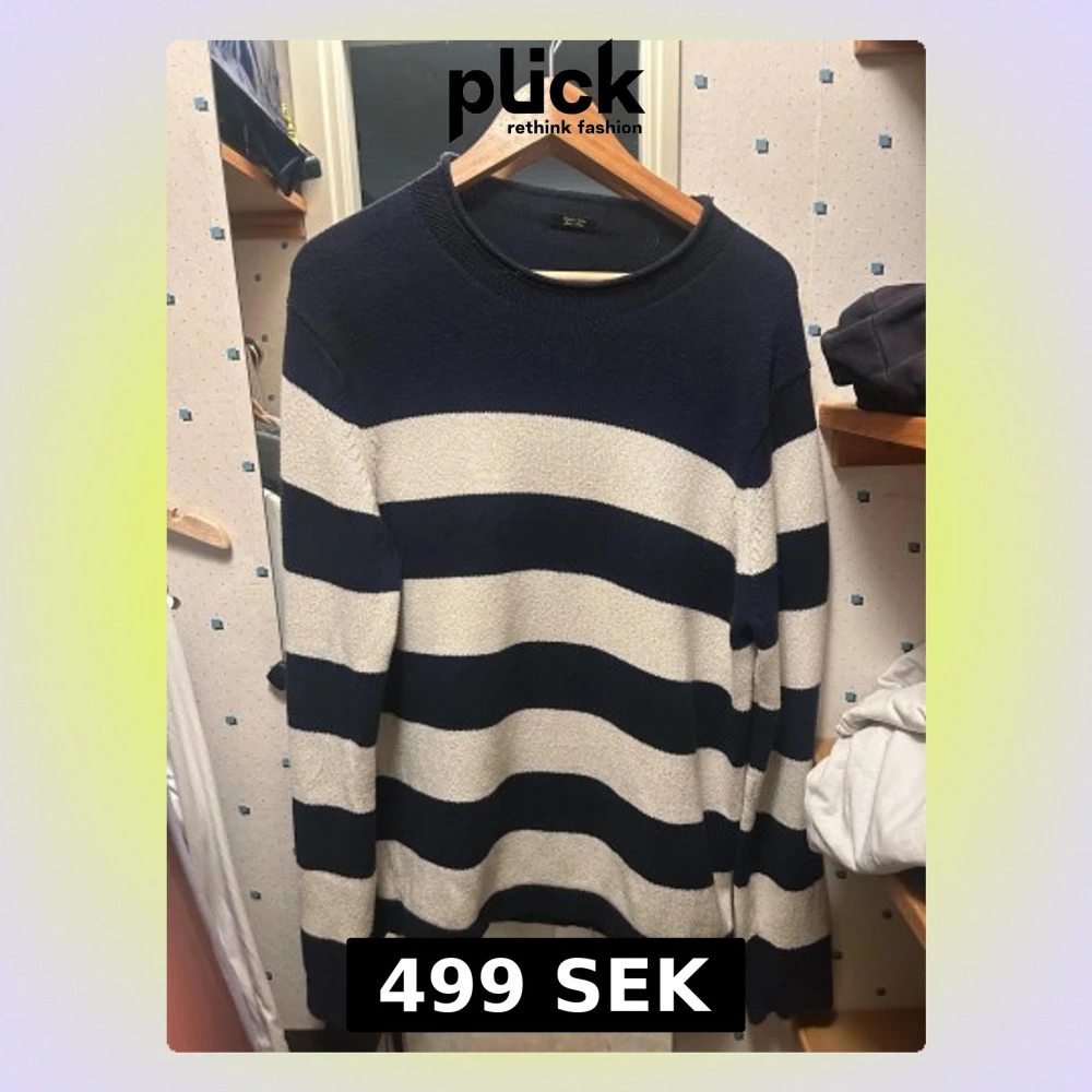 Säljer en snygg stickad tröja från Massimo Dutti i exklusiv bomull. Tröjan har breda marinblå och vita ränder, rund hals och långa ärmar. Perfekt för dig som gillar klassisk stil med en modern twist. Passar till jeans eller chinos.