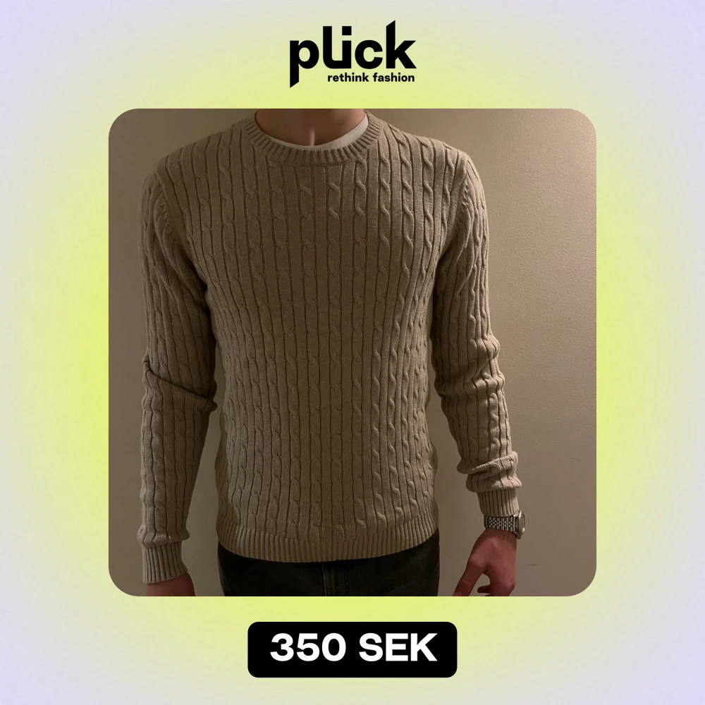 Säljer en snygg beige stickad tröja med kabelstickat mönster. Perfekt för kyliga dagar och passar både till vardags och lite finare tillfällen. Tröjan har långa ärmar och en rund halsringning. Den är i bra skick och skön.