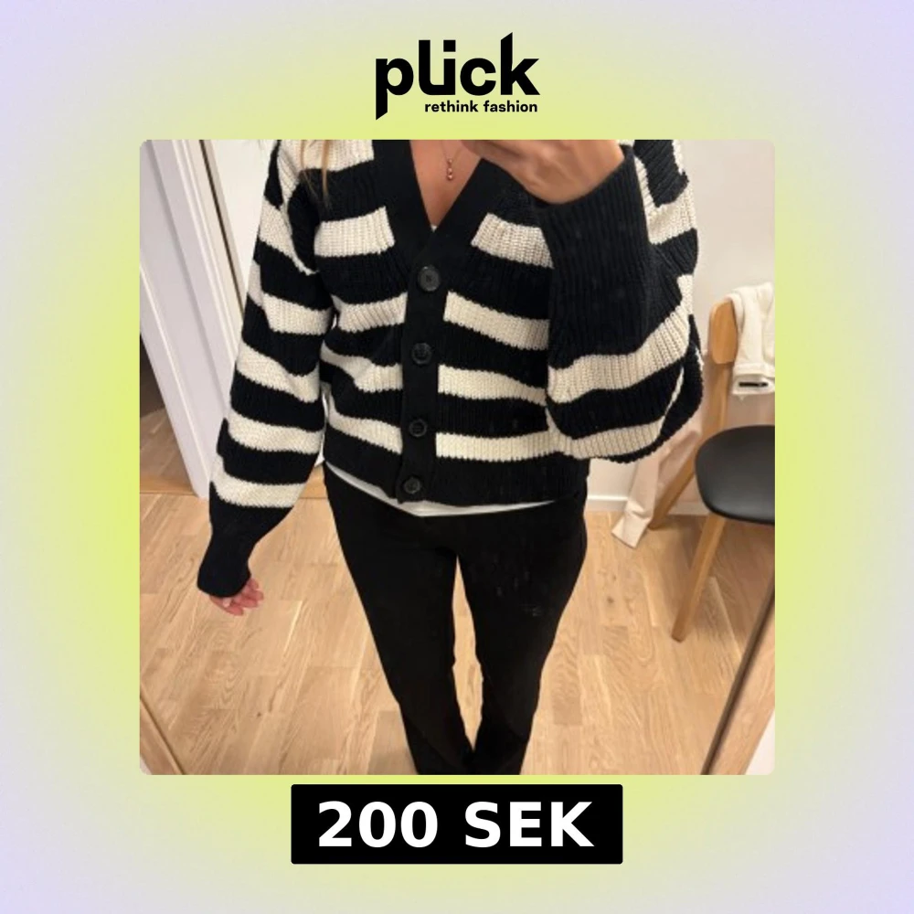 Säljer en svartvit randig kofta med grovstickat material och stora svarta knappar framtill. Koftan är croppad med lång ärm och har en djup v-ringning. Den är från H&M och är i storlek S💞