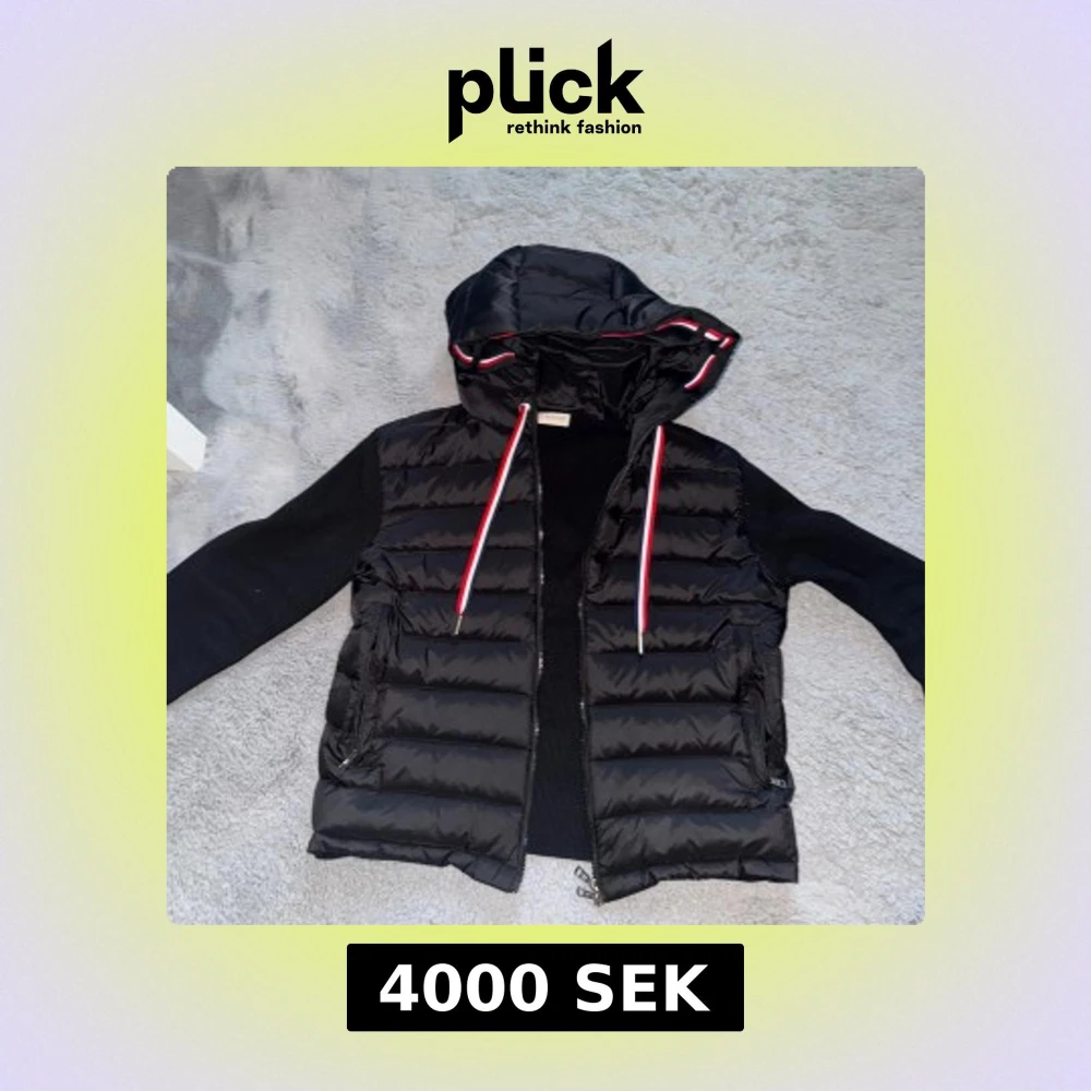 Svart pufferjacka från Moncler med stickade ärmar och rygg, quiltad framsida och huva. Jackan har dragkedja, två fickor och coola snören i rött, vitt och blått. Moncler-logga på ena ärmen. Perfekt för dig som vill ha en snygg och sportig look.