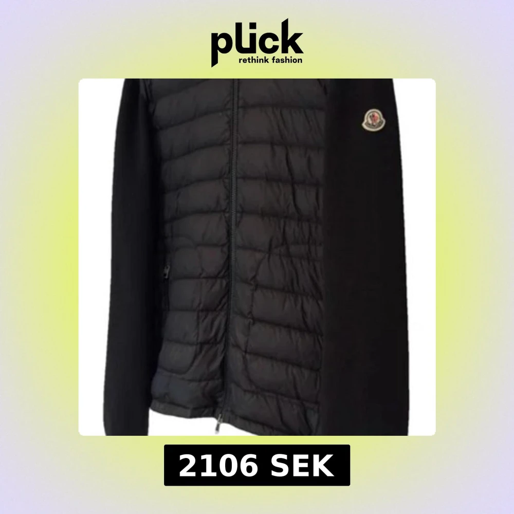 Svart cardigan jacka från Moncler med quiltad front och stickade ärmar. Jackan har dragkedja hela vägen och Moncler-logga på vänster ärm. Snygg, stilren och perfekt för dig som gillar exklusiva märken och vill ha en jacka som sticker ut. Storlek L men passar även M. 2 defekter, skriv för bild