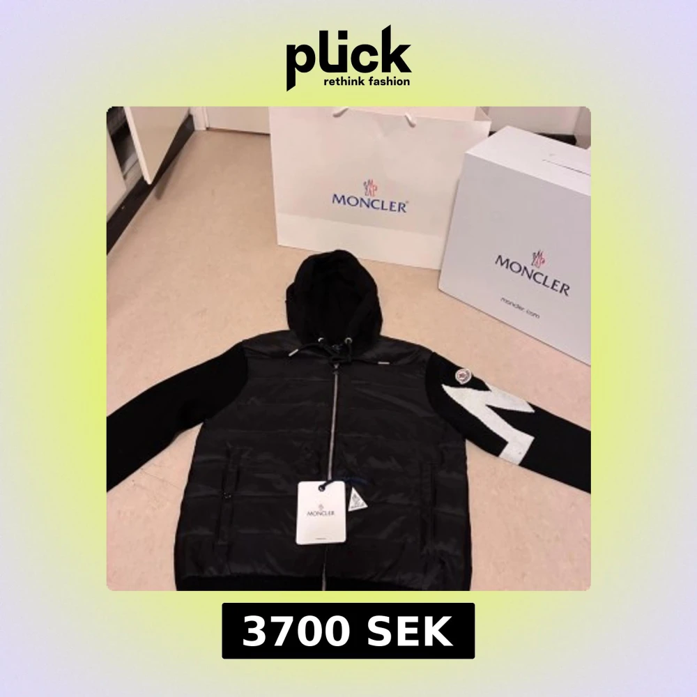 Svart pufferjacka från Moncler med huva och snörning. Jackan har stickade ärmar med vit zigzag-mönster och Moncler-logga på vänster ärm. Dragkedja framtill och två sidofickor. Perfekt för dig som vill ha en snygg och unik jacka med streetkänsla.
