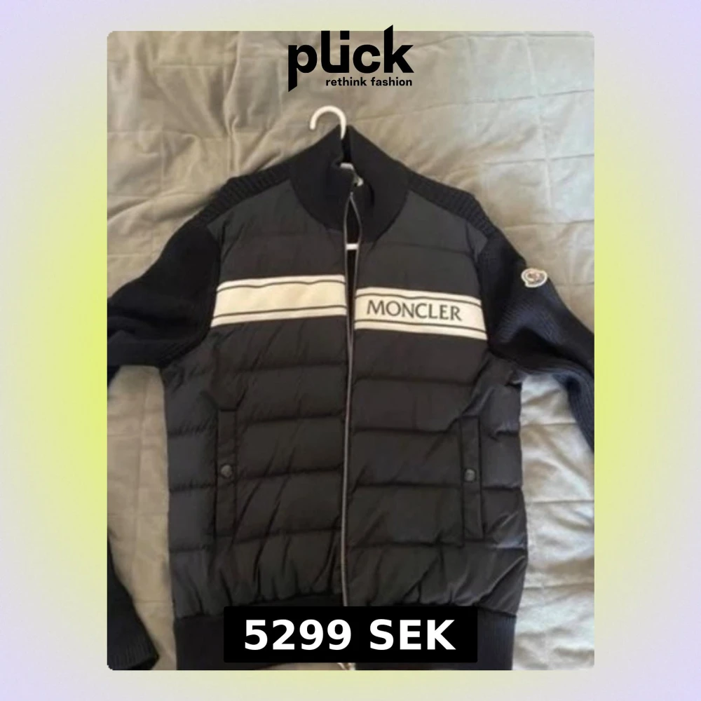 Säljer en svart pufferjacka från Moncler med stickade ärmar och rygg. Jackan har vit logga och rand över bröstet, hög krage och dragkedja framtill. Klassisk Moncler-patch på ena ärmen. Perfekt för dig som vill ha en snygg och sportig look. Priset kan diskuteras.