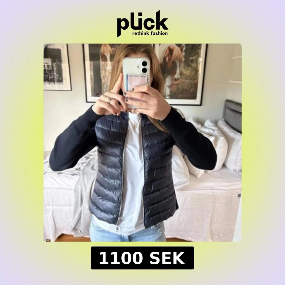 Säljer en svart pufferjacka från Moncler med stickade ärmar och quiltad framsida. Jackan har dragkedja och Moncler-logga på ärmen. Perfekt för dig som vill ha en snygg och chill look med exklusiv känsla. Passar till jeans och sneakers.