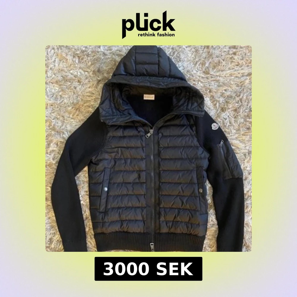 Svart pufferjacka från Moncler med stickade ärmar och vadderad kropp. Jackan har en stor huva, dragkedja framtill och två fickor med tryckknappar. Moncler-logga på ena ärmen och ribbade muddar vid ärmslut och nederkant. Perfekt för kyliga dagar.
