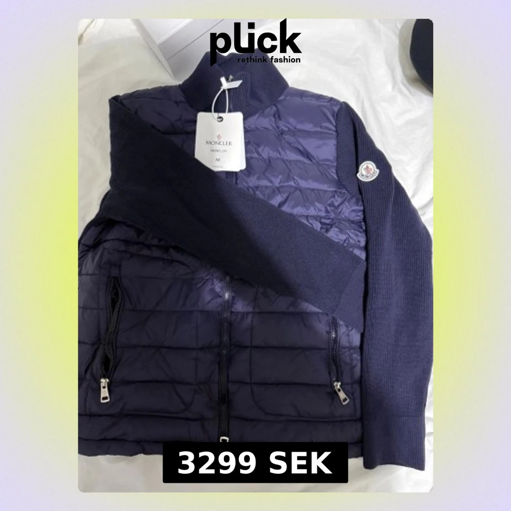 Snygg mörkblå quiltad jacka från Moncler med stickade ärmar och hög krage. Jackan har två dragkedjefickor framtill, hel dragkedja och klassisk Moncler-logga på ärmen. Perfekt för dig som vill ha en stilren och exklusiv look.