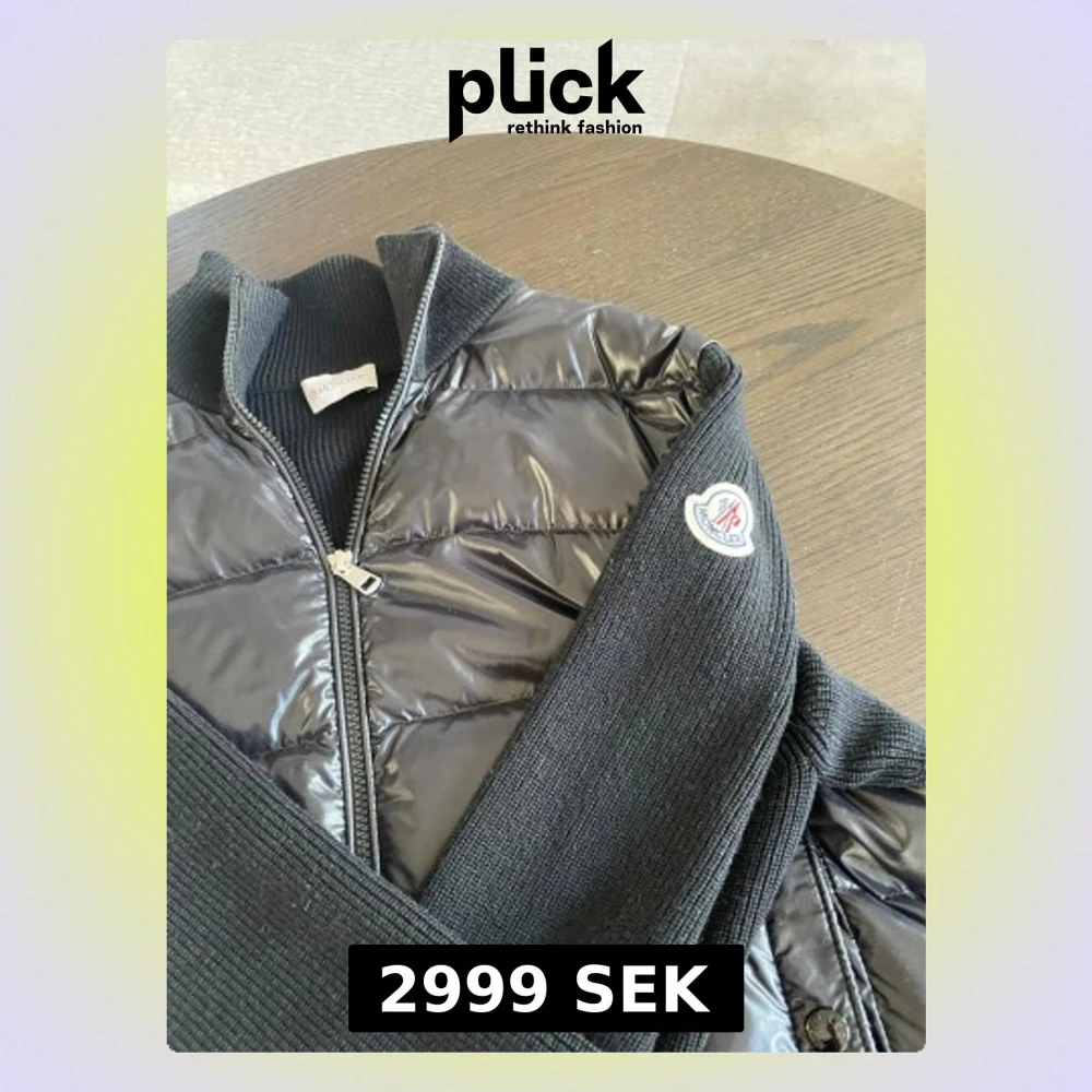 Snygg svart pufferjacka från Moncler med glansig quiltad front och stickade ärmar. Jackan har dragkedja, ribbad krage och muddar samt Moncler-logga på ärmen. Perfekt för dig som vill ha en cool och exklusiv look. Knappt använd