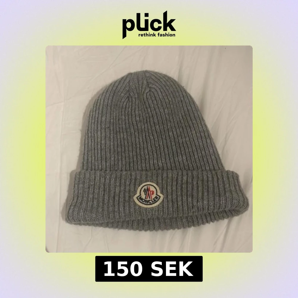 Snygg grå ribbstickad mössa från Moncler med klassisk uppvikt kant och broderad logotyp framtill. Tillverkad i mjukt och värmande material, perfekt för kyliga dagar. Enkel och stilren design som passar till det mesta. Vet ej om den är äkta därav priset