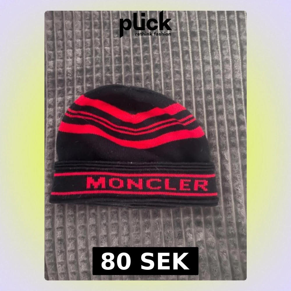 Snygg svart mössa från Moncler med röda ränder och logga framtill. Den är stickad och har en klassisk form som passar perfekt för kalla dagar. Ränderna ger en cool kontrast och loggan gör den extra stilren.