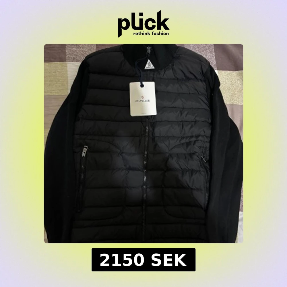 Svart dunjacka från Moncler med quiltad front och stickade ärmar. Jackan har dragkedja framtill och två sidofickor med dragkedja. Klassisk Moncler-logga på ärmen och ribbad krage. Perfekt för kyliga dagar med stil.