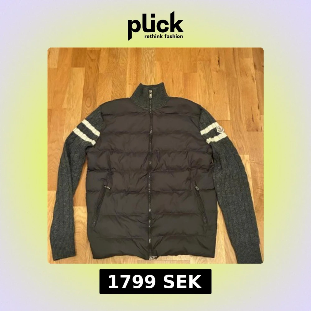 Snygg pufferjacka från Moncler i mörkgrått med stickade ärmar och krage. Ärmarna har vita ränder och Moncler-logga på vänster arm. Jackan har dragkedja framtill och två fickor med dragkedja. Perfekt för kyliga dagar när du vill ha både stil och komfort.