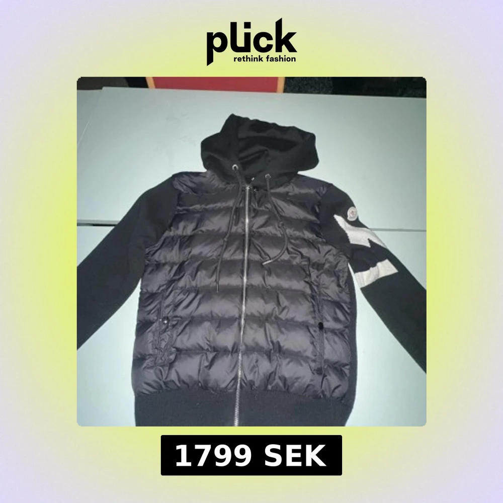 Snygg svart pufferjacka från Moncler med stickade ärmar i svart och grått zigzag-mönster. Jackan har huva med snörning, dragkedja framtill och två fickor med knappstängning. Perfekt för dig som gillar streetstyle och vill ha något som sticker ut.