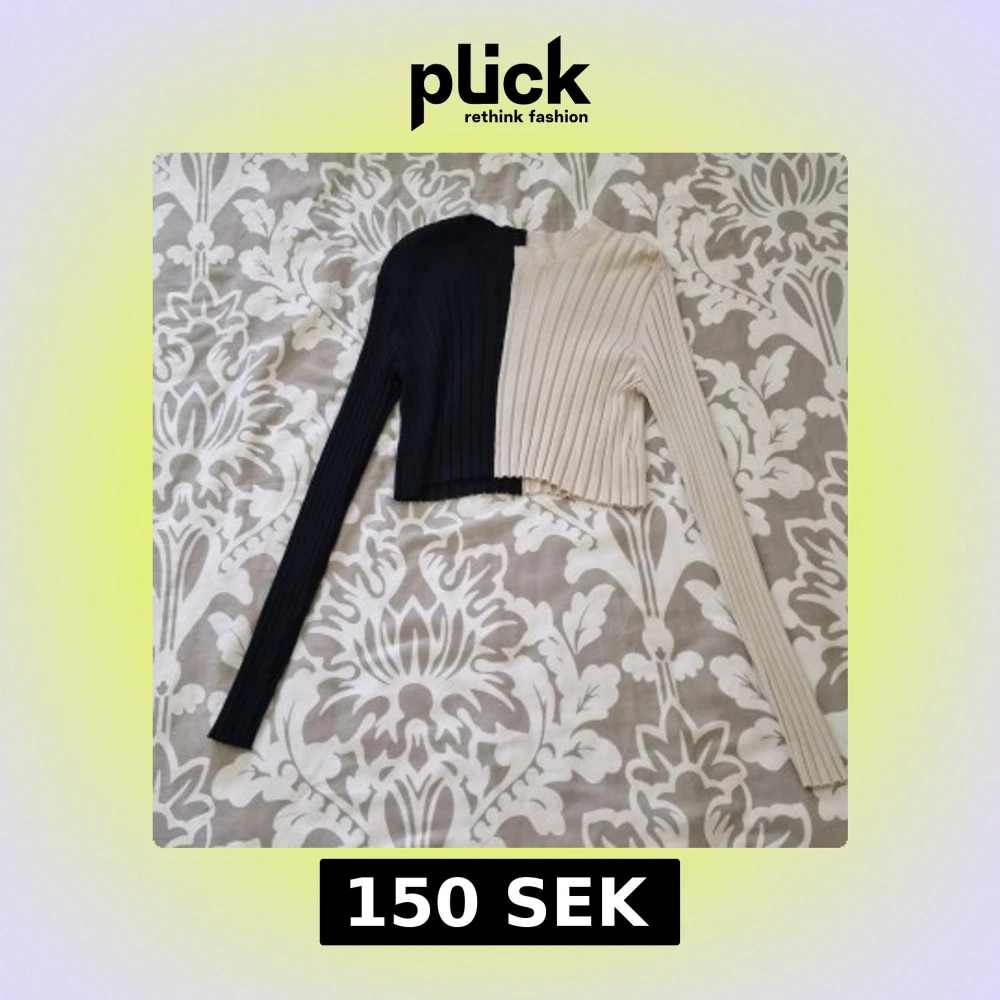 Säljer en ribbstickad långärmad tröja från Monki i storlek L. Tröjan är croppad och har en cool tvåfärgad design med ena halvan svart och andra halvan beige. Oanvänd och tvättad 1 gång.