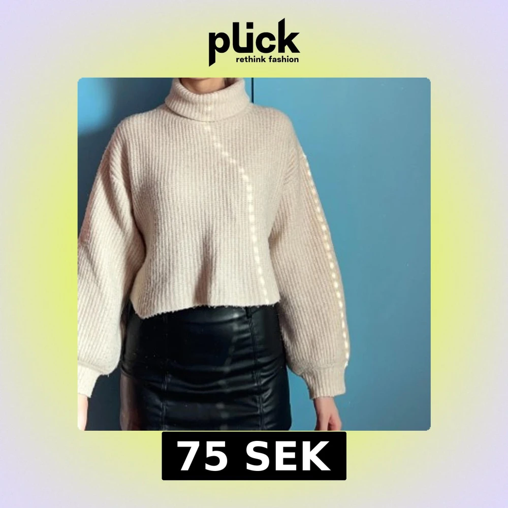 Beige stickad polotröja - Säljer en beige stickad polotröja med ribbad hög krage och långa ärmar. Tröjan har en enkel och stilren design, perfekt för att hålla värmen under kyliga dagar. Mjuk och skön känsla tack vare det stickade materialet.