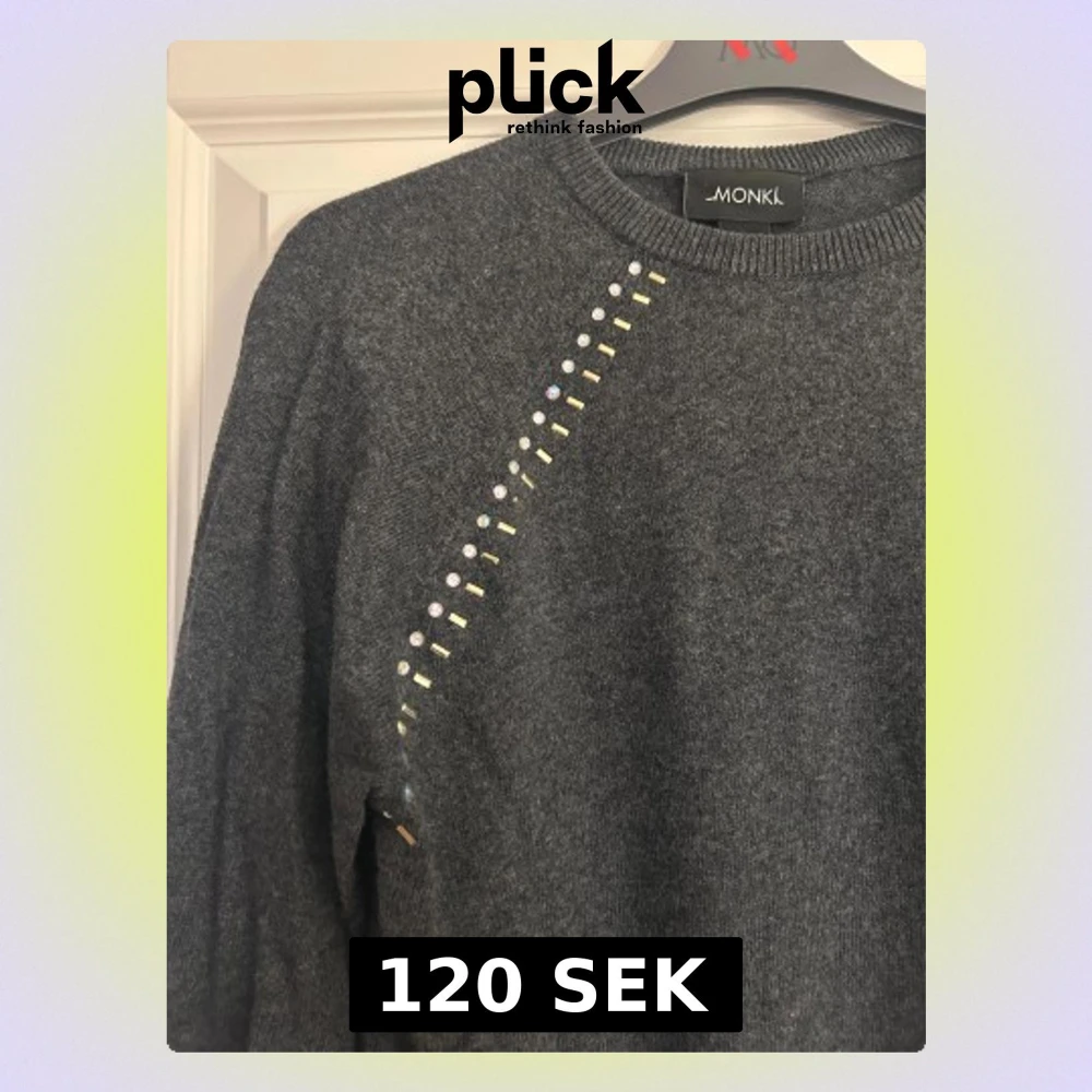 Snygg mörkgrå tröja från Monki med coola pärldetaljer och små metallstavar längs axlarna. Rund hals och långärmad modell. Materialmix av bomull, viskos, polyamid och angora som gör den mjuk och skön. Använd ngt ggr bara , fin ;)