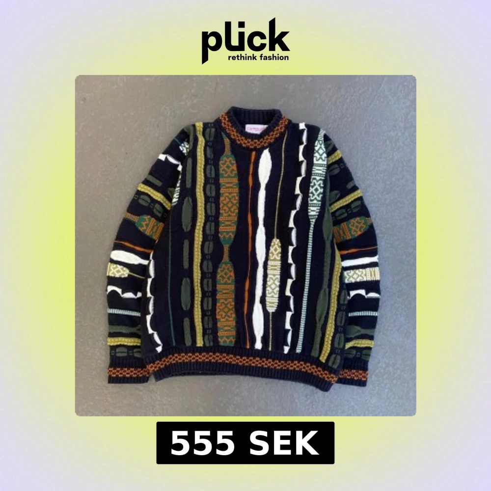 Fet stickad tröja från Campus i storlek XL med unikt mönster i svart, grön, orange, vit och oliv. Tröjan har ribbade muddar och krage, och är tillverkad i 100% bomull. Perfekt för dig som gillar retrovibbar och färg.