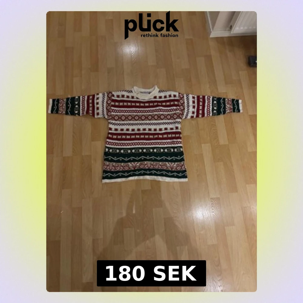Säljer en mysig stickad tröja från Katies med klassiskt mönster i vinrött, grönt och vitt. Tröjan har långärmad passform, rund hals och är perfekt för kalla dagar. Den har en loose fit och är tillverkad i mjukt stickat material. Storlek M ( uk storlek 12 )