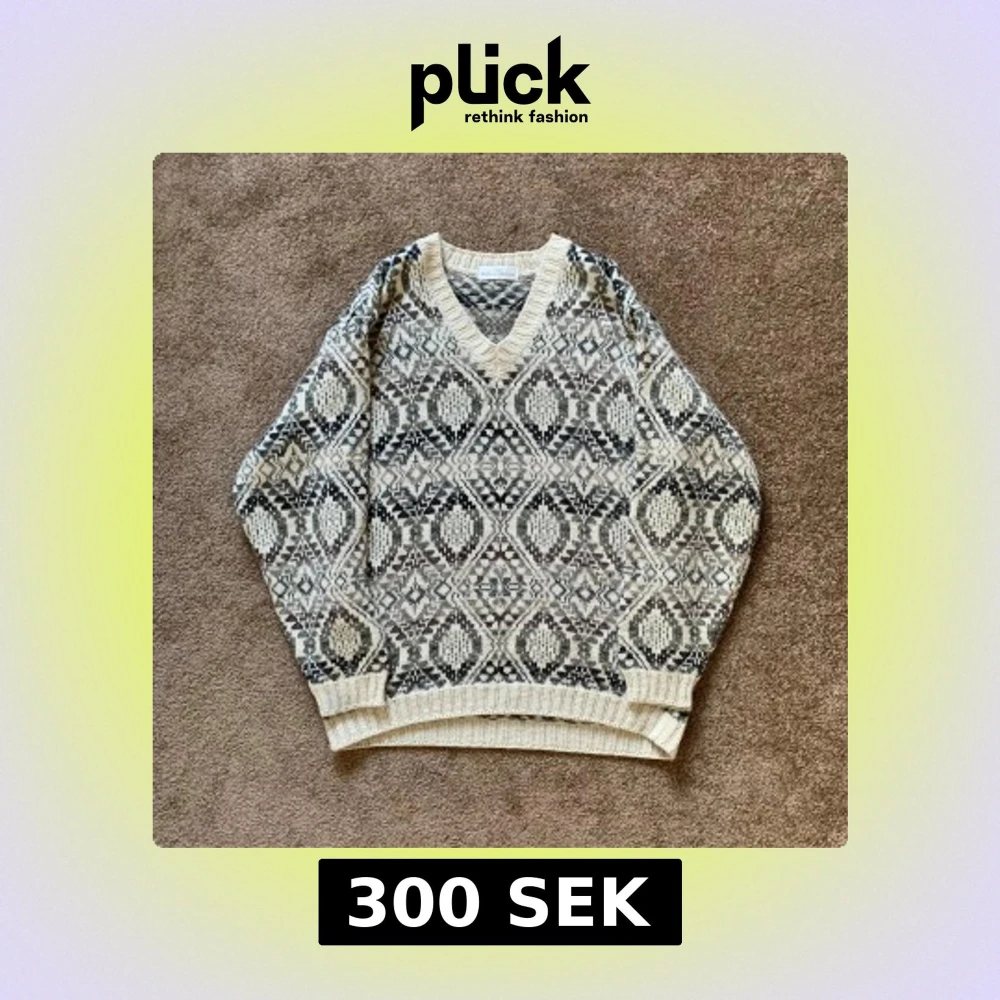 Stickad tröja från Marks & Spencer med snyggt geometriskt mönster i beige, grått och svart. V-ringad med ribbade muddar och avslut. Materialmix av akryl, alpacka och ull gör den både mjuk och varm. Perfekt för kyliga dagar.