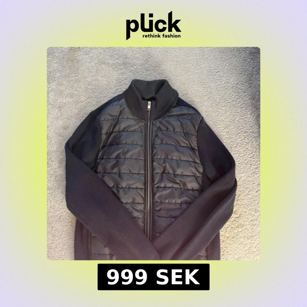 Mörkblå cardigan med quiltad framsida och stickade ärmar. Perfekt för kyliga dagar och enkel att matcha med andra plagg.