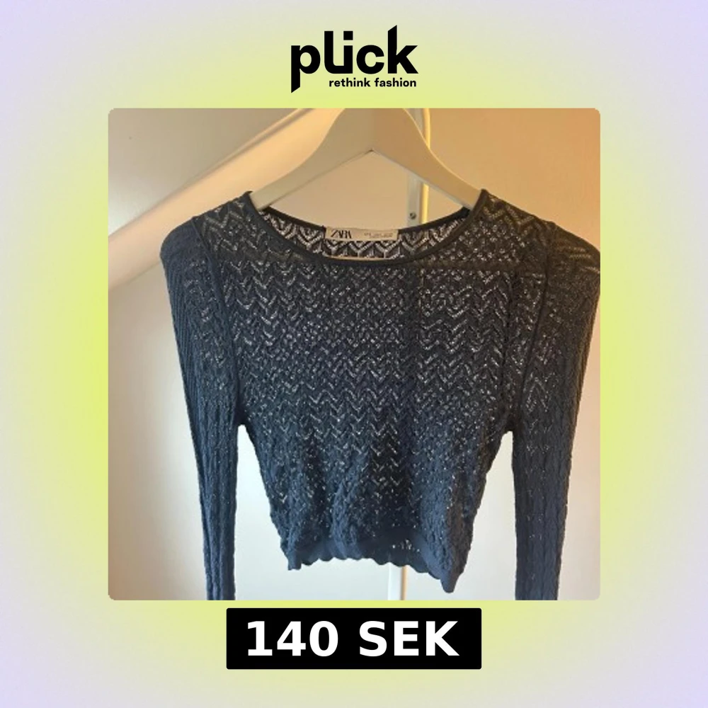 Snygg mörkblå croppad topp från Zara med lång ärm och transparent stickat mönster. Toppen har en rund halsringning och ett coolt zigzag-mönster som ger en unik vibe. Perfekt att styla med höga jeans eller kjol för en trendig look.