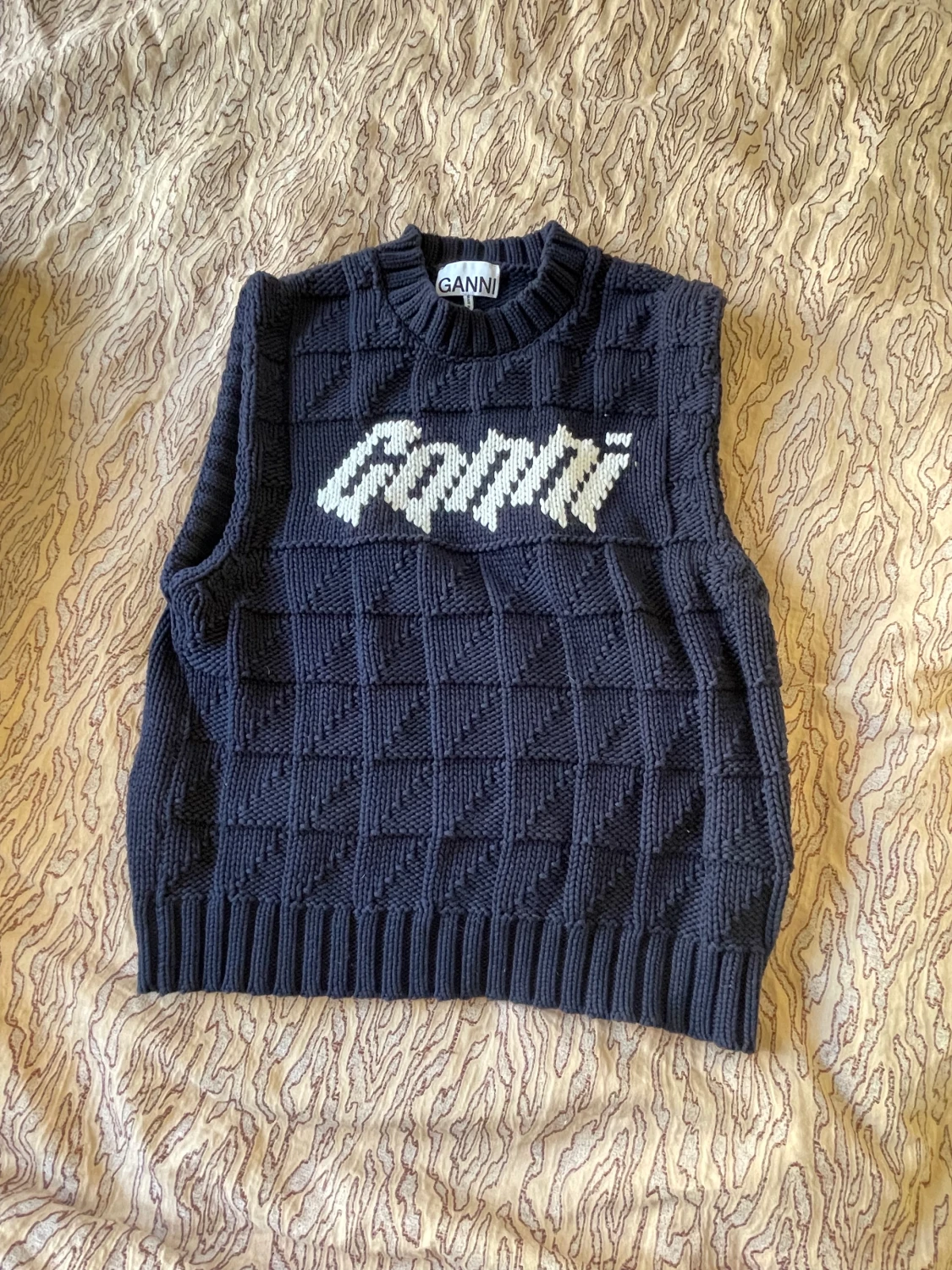 Mörkblå/vit väst från ganni. Använd ett fåtal gånger.