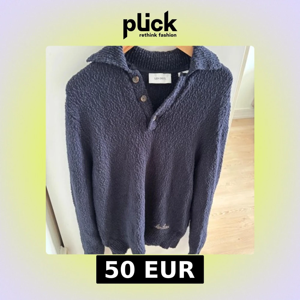 Mysig mörkblå stickad tröja från Les Deux med grov struktur, krage och knappar vid halsen. Broderad logga på ärmen och ribbade muddar. Perfekt för lager-på-lager och chill dagar.