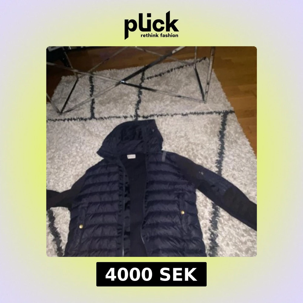 Snygg mörkblå pufferjacka från Moncler med stickade ärmar och huva. Jackan har dragkedja framtill, guldiga knappar på fickorna och en extra ficka med dragkedja på ärmen. Perfekt för dig som vill ha en unik och varm jacka med coola detaljer.all scann fungerar och jackan är äkta