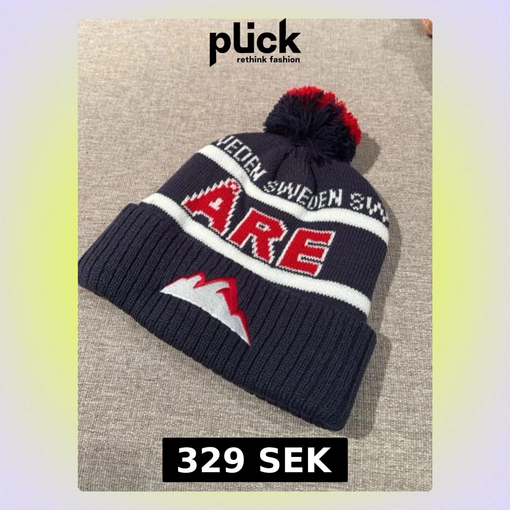 Snygg mörkblå stickad mössa med vit och röd brodyr, stor ÅRE-text framtill och broderat bergmotiv på uppvikt kant. Tofs i mörkblått och rött på toppen. Perfekt för kalla dagar och vinterhäng i fjällen.