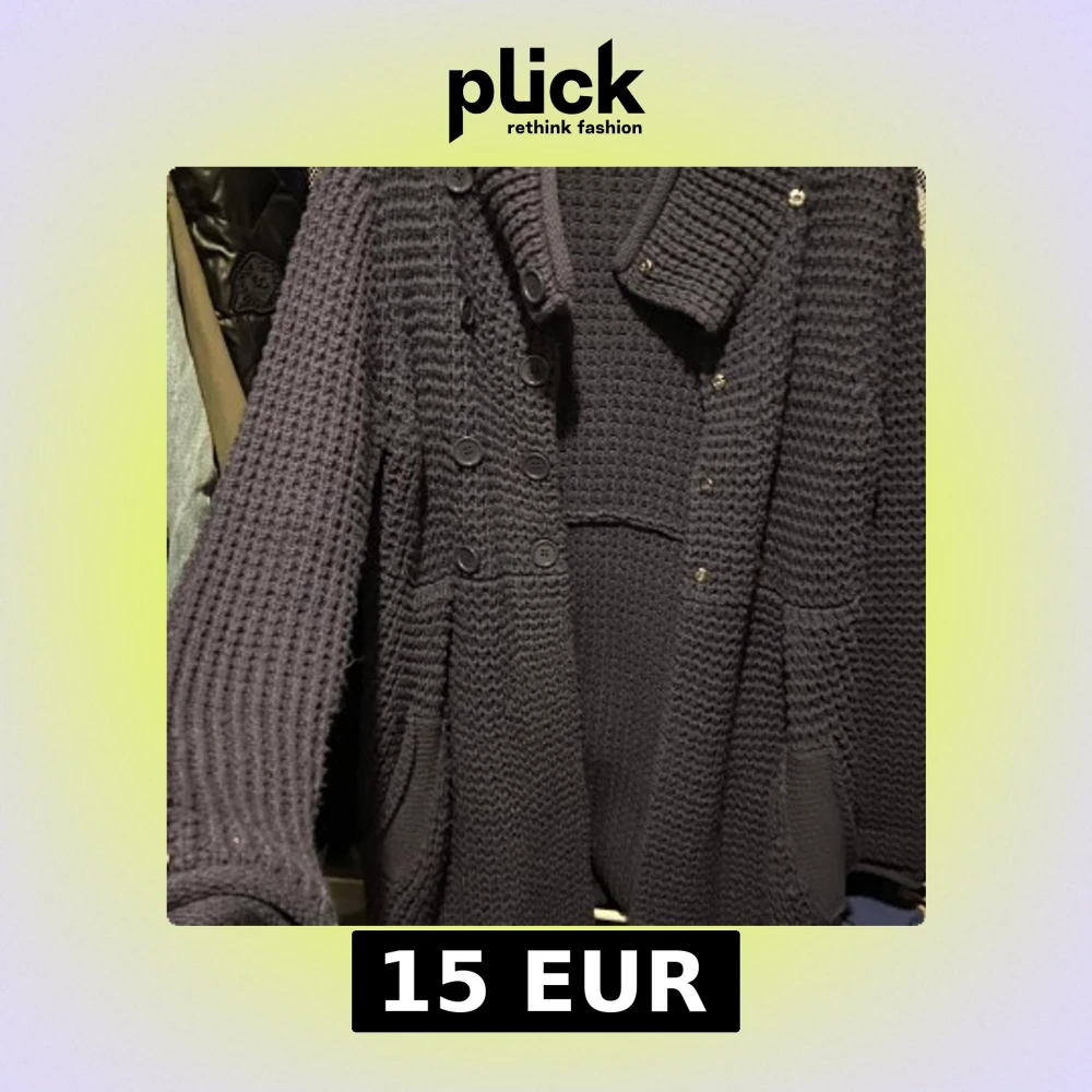 Säljer en snygg mörkblå stickad kappa från French Connection. Den har en dubbelknäppt design med stora knappar och praktiska fickor framtill. Perfekt för kyliga dagar med sin långa ärm och mysiga material.