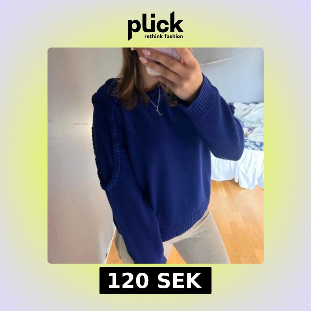 Säljer en snygg mörkblå stickad tröja med flätade detaljer på ärmarna.
