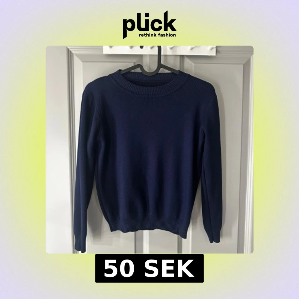 Säljer en stilren mörkblå stickad tröja med rund halsringning. Tröjan har långa ärmar och ribbade muddar vid ärmslut och nederkant❣️