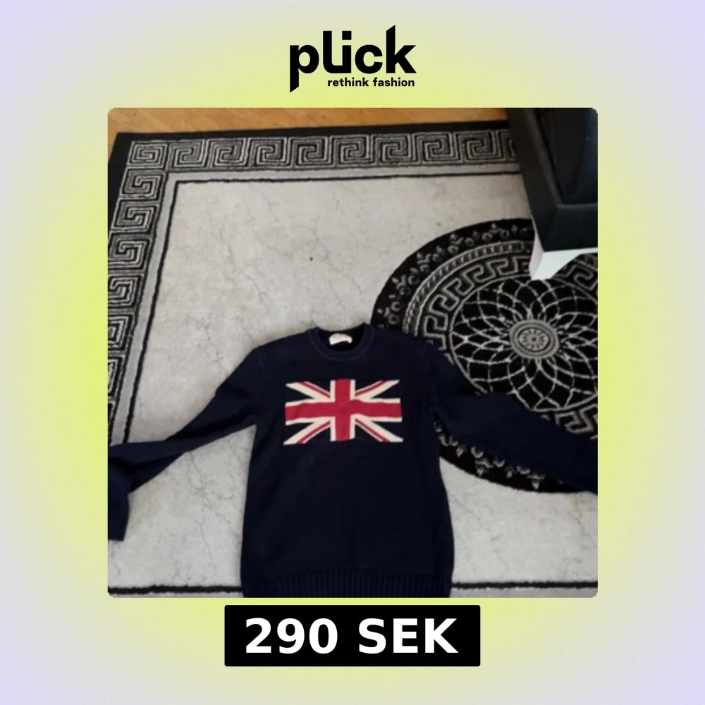 Mörkblå stickad tröja från Crocker i storlek S. Tröjan har ett stort Union Jack-flagga-motiv framtill i rött, vitt och blått. Tillverkad i 100% bomull med ribbade muddar och rund hals. Perfekt för dig som gillar brittisk stil.