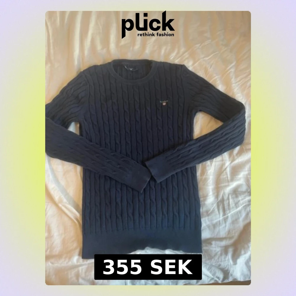 Säljer en mörkblå stickad tröja från GANT i storlek S. Tröjan har ett klassiskt kabelstickat mönster, rund hals och långa ärmar. Diskret GANT-logo broderad på bröstet. Perfekt för dig som gillar stilrena och tidlösa plagg.