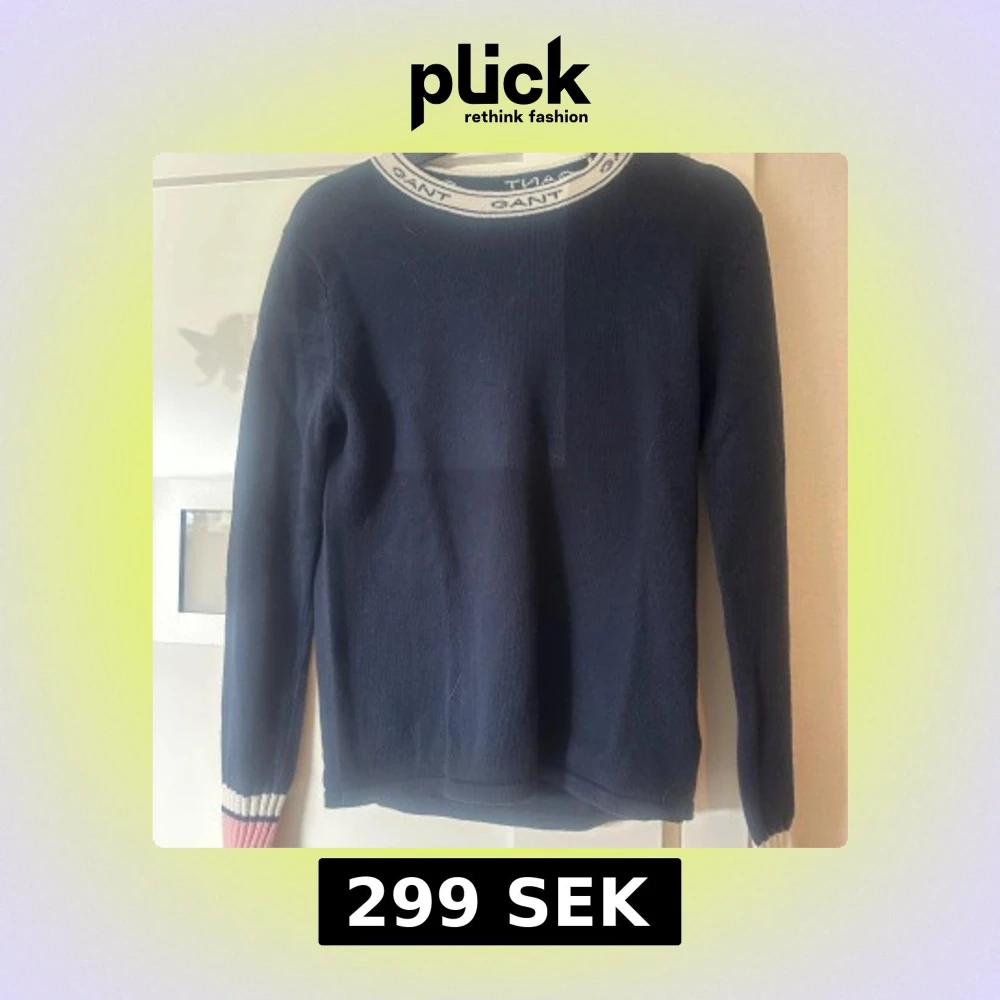 Säljer en mörkblå stickad tröja från Gant med vita och röda detaljer vid halsringning och ärmslut. Tröjan har lång ärm och Gant-logga runt halsen. Perfekt för en stilren och klassisk look. Strl 170/s
