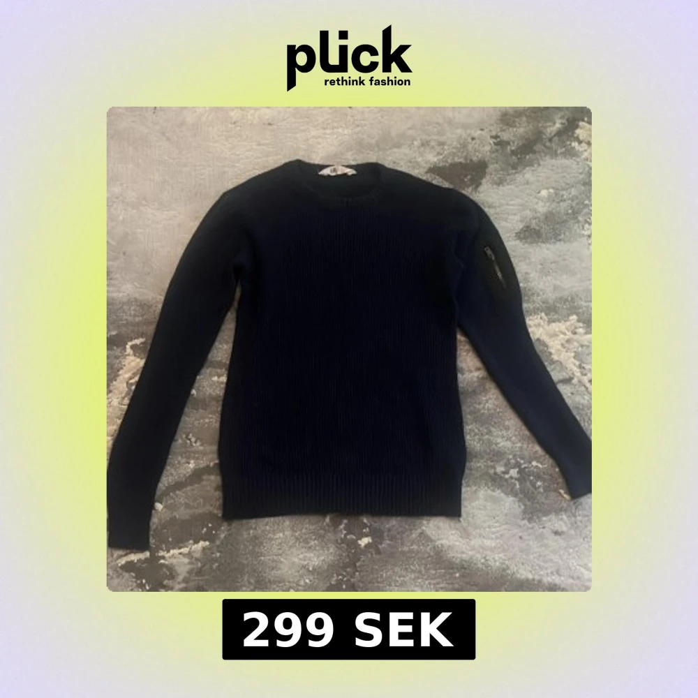 En stilren mörkblå stickad tröja från H&M med rund halsringning och ribbade muddar. Tröjan har en klassisk passform och är tillverkad i ett mjukt, grovstickat material som passar perfekt till kyligare dagar.