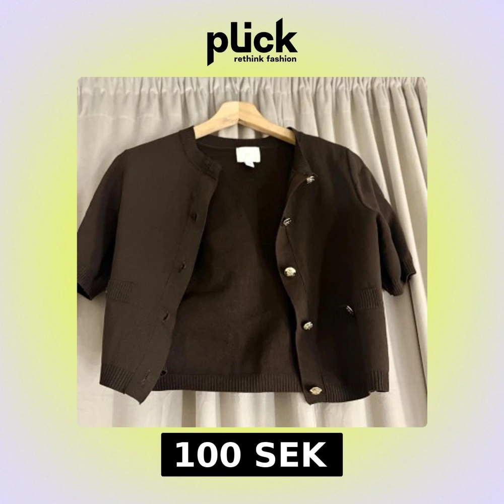 Kortärmad mörkbrun stickad kofta med snygga guldknappar framtill. Koftan har ribbade muddar vid ärmslut och nederkant samt små fickor framtill. Perfekt för lager-på-lager och en stilren look.