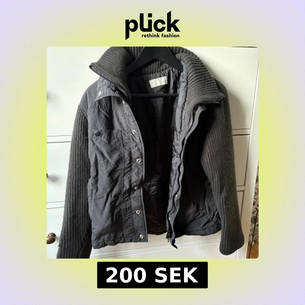 Snygg svart jacka med stickade ärmar och krage. Jackan har dragkedja och knappar framtill samt en bröstficka med knapp. Kan va både drainer o Sthlm stil absolut🕺