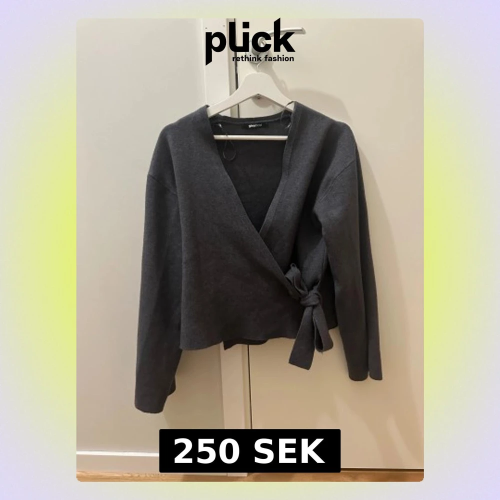 Snygg mörkgrå omlottkofta från Gina Tricot i mjukt stickat material. Koftan har v-ringad hals, långa ärmar och knyt i sidan för en cool och avslappnad look. Perfekt att slänga på sig när det är lite kyligt ute. På ena ärmen har den lite blekning på men de är så lite så de märks knappt. (jobbar som frisör)🥰🫶