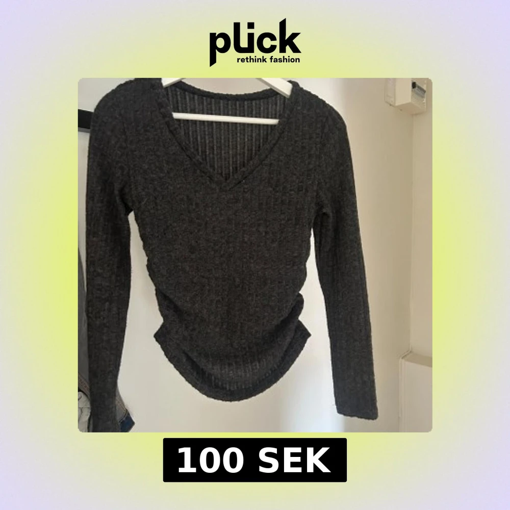 Mysig mörkgrå stickad tröja med ribbad struktur och v-ringning. Tröjan har lång ärm och är perfekt för kyligare dagar. Enkel att matcha med jeans eller kjol för en avslappnad look.