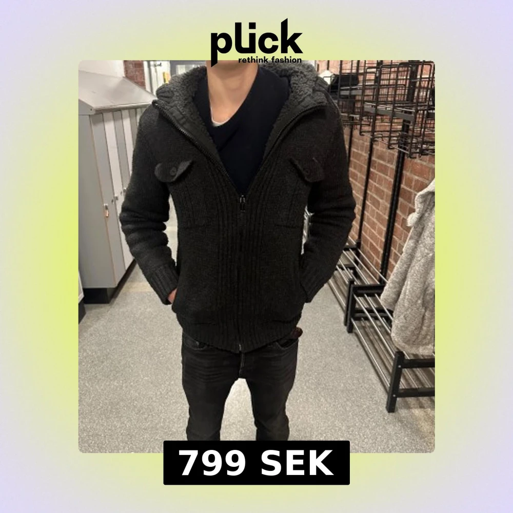 Säljer en mörkgrå stickad hoodiejacka från dissident med dragkedja och två bröstfickor med knappdetaljer. Jackan har en mysig huva med mjukt varmt foder och ribbade muddar vid ärmslut och nederkant. Perfekt för kalla dagar och riktigt skön att bära. Storlek S. Modellen är 185 cm och väger 65 kg. Typ nyskick.
